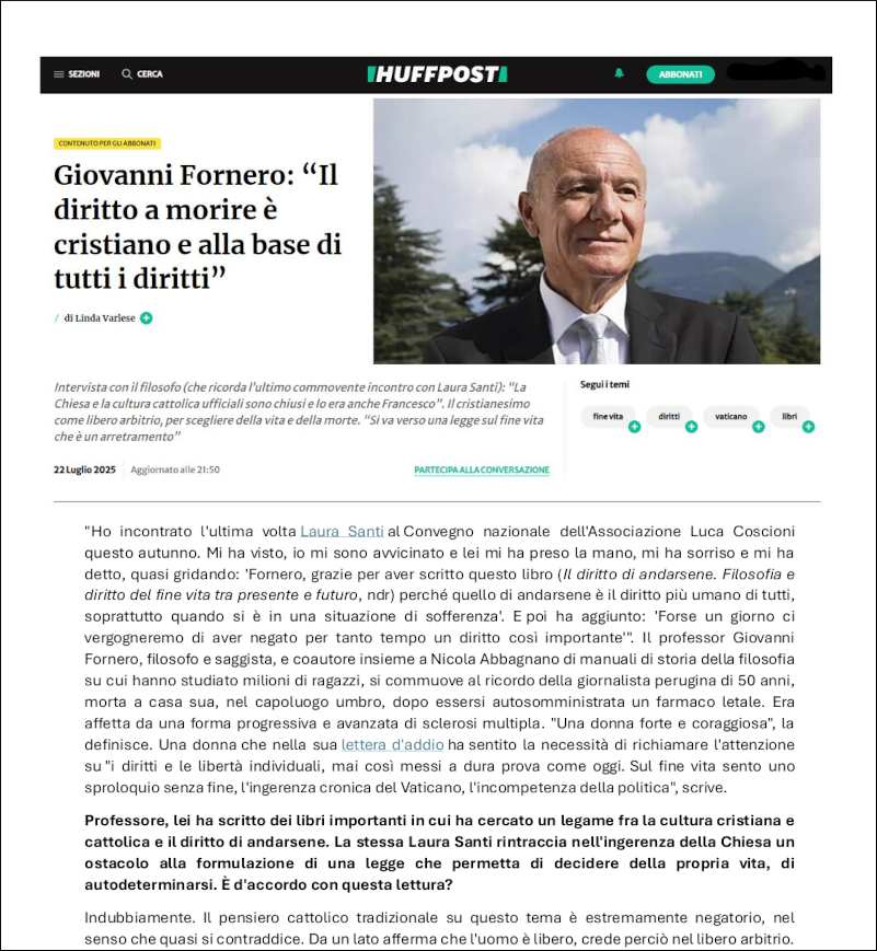 Il 22 luglio 2025 è apparsa in «Huffpost» un'intervista a Giovanni Fornero sui problemi del fine vita, anche in riferimento al suo volume Il diritto di andarsene.