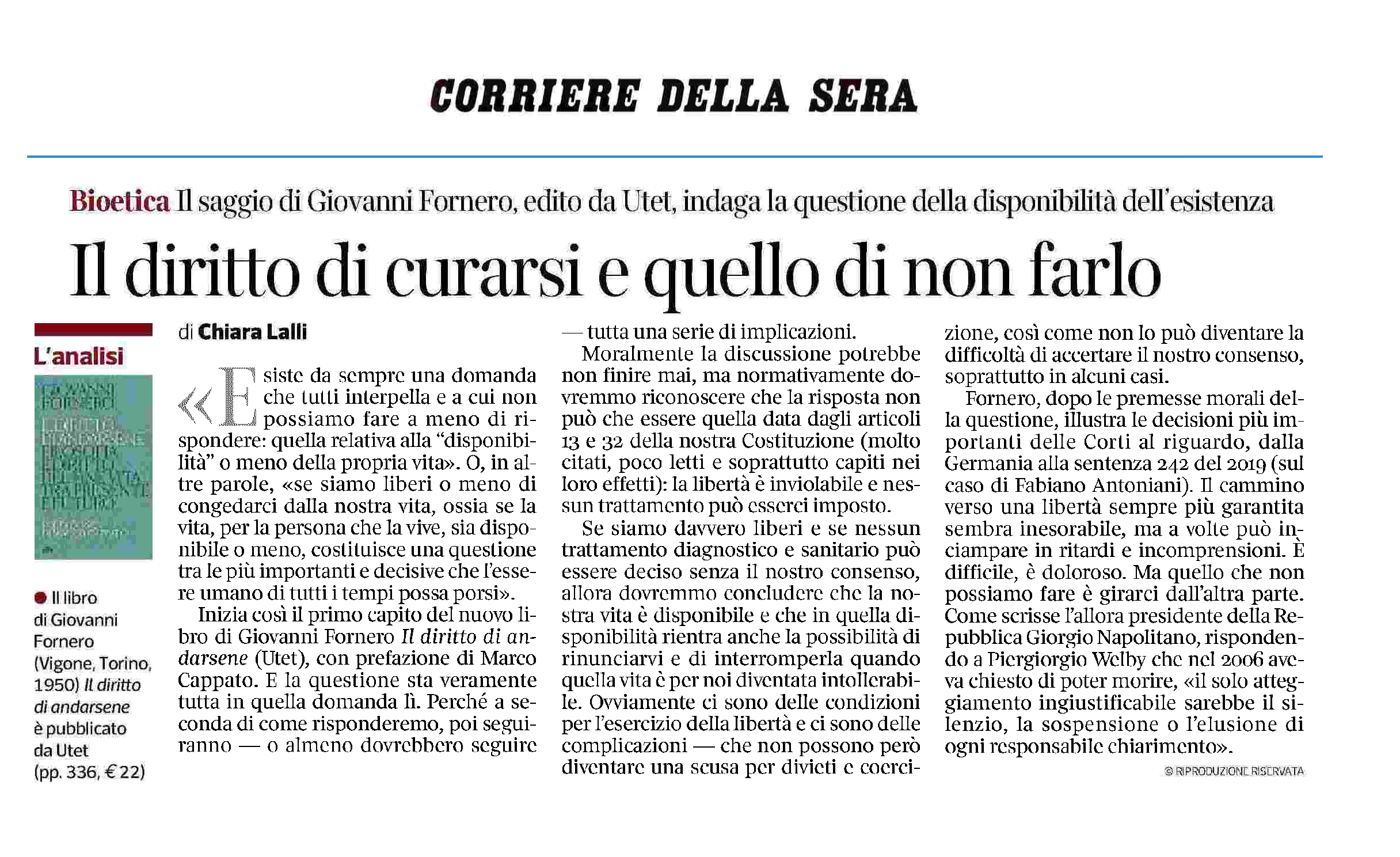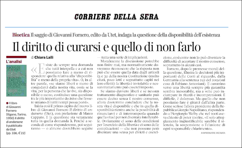 Sabato 6 gennaio 2024 è apparsa nel «Corriere della Sera» una recensione a firma di Chiara Lalli de Il diritto di andarsene.