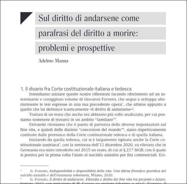 Adelmo Manna ha scritto un saggio intitolato Sul diritto di andarsene come parafrasi del diritto a morire: problemi e prospettive che prende spunto dal libro di Fornero.