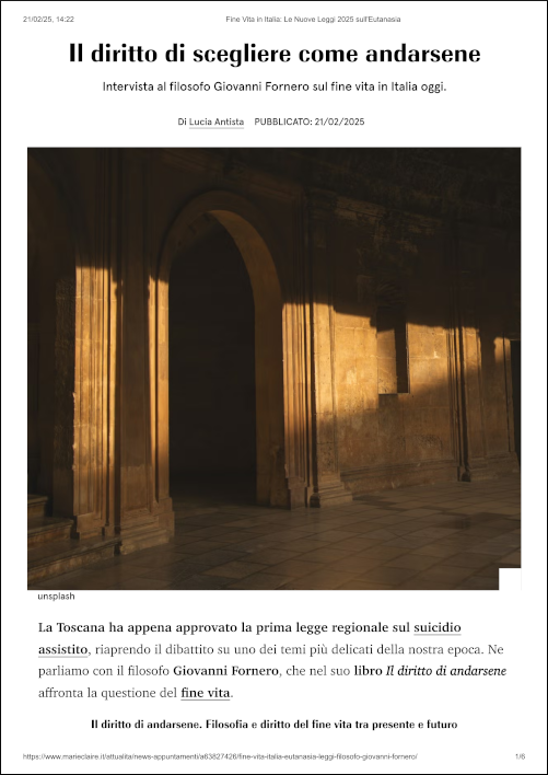 Il 21 febbraio 2025 è apparsa in «Marieclaire» un'intervista a Giovanni Fornero su Il diritto di andarsene e sui problemi del fine vita, in occasione dell'approvazione, da parte della Regione Toscana, della prima legge italiana sul suicidio medicalmente assistito.